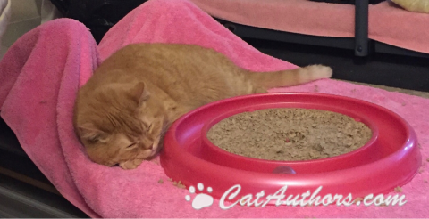 Play, watch out the windows 'n doors, eat, & sleep. So far today, I played, I watched, I ate & now I sleep. It's what cats do. We sleep 16 - 18 hours/day. All of that twistin' & turnin' playin' "Circles" plum wore me out, if you know what I mean. I couldn't do one more circle 'round that track so I "crashed," guess you can see that. Be sure & watch my video next.