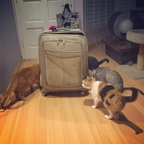 Meowmuh just returned from the BlogPaws and Cat Writers' Conference in South Carolina. She's been gone for 5 whole days!! We helped her pack, now we're gonna' help her unpack. But first, we gotta' check out her luggage. Meowmuh calls us her "sniff patrol."