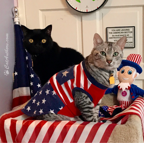 Inkee-Bear & I are hard-core patriotic Americats, know what I mean? Just wanna' wish all you two-legged and four-legged patriots out there a safe and Happy Fourth of July. Meowmuh has the TV on so the noises aren't too bad & she sprayed Feliway to calm us. Actually, I'm goin' to take a little nap, you know, a cat nap.