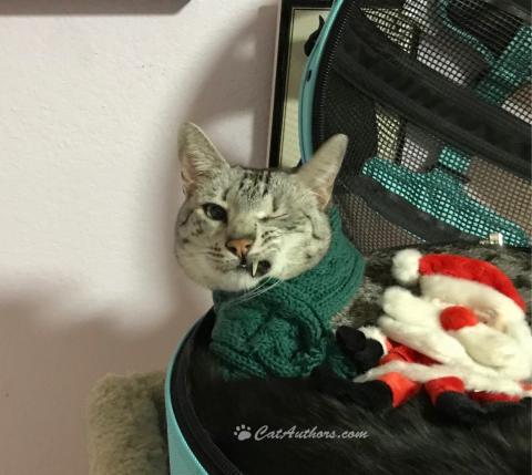First I have to wear this dumb scarf, Inkee says I haven't been good, early this morning hoomans made loud noises power-washing our house & windows cause of the soot from the fire, so I ate breakfast too fast & threw up & now my whiskers got caught on my sweater. I hope your day is going better. Bah, humbug.