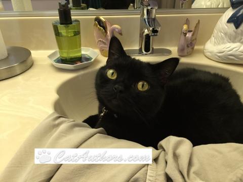 I love sinks! I'm upstairs, in the round bathroom sink. What's really fun is unscrewing the top to the drain. Then push it onto the counter & out onto the floor. Meowmuh didn't think a cat could do it but one day I showed her. None of our sinks or tubs have drain tops now. I guess she put them all in a drawer.