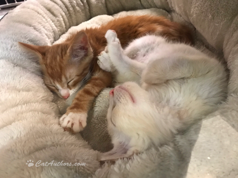 Meet two precious kittens at the Pasadena Humane Society's 'Neely Center for Cats.' These two little ones are in the midst of a serious kitten-nap. They must really be tired because there were a lot of people milling around looking to adopt. NOTICE: They are sleeping IN their cushy little bed. The kittens in the next pic found their own, unique place to nap.