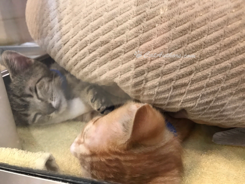 See these two babies? They're not sleeping IN their bed. They're sleeping UNDER it. Meowmuh had a cat named Tigger that loved to sleep UNDER things. He taught Gracee to sleep & hide under blankets, towels--you name it. Gracee's fav is under the comforter in the bedroom. If you walk in the bedroom & see a small lump in the bedcovers, it's probably Gracee. If the lump moves, it's fur shure Gracee. Hope someone adopted these little ones. There were quite a few senior cats there too. They looked bewildered which made Meowmuh sad.