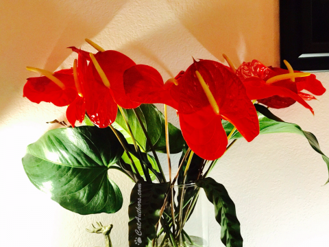Meowmuh discovered a long white box leaning on the front door yesterday. The gift card on the front of the box said: "Thank you for being such a good mommy to us. Love, Gracee, Inkee, Sophee & Spirit." How did we cats send her flowers? Well, we'll tell you. Our Auntie Laurel did one of those things that only hoomans can do. She sent our Meowmuh a Meowmuh's Day gift -- these beautiful flowers from Hawaii. Thank you, Auntie Laurel.