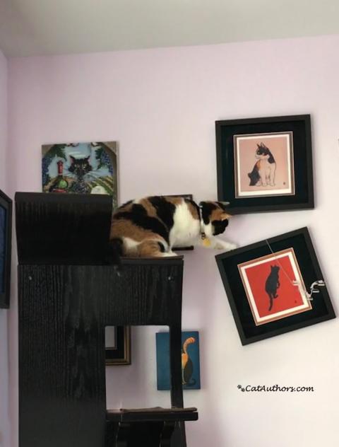 OK. I went one step higher. I'll get it, don't get your whiskers frazzled. I can do this. I'm balanced, I'm reaching, reaching---oh, oh. I can't quite get it. Oh, no. The stupid picture moved! Now it's all crooked! Meowmuh won't notice. She's busy & tired. Besides, I know what to do. Done it before, can do it again. I'll act nonchalant. I'll be my usual sweet & innocent self. It works every time.