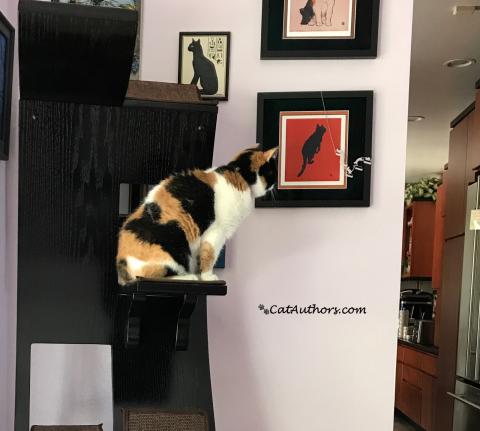 Do you see what I see from our new cat tree? Look at the corner of that picture. It's Meowmuh's new cat necklace! How can I get it? Maybe if I go up one more step. It would be so fun to bat around. The other cats would love it too. They're always saying: "Sophee, you find such fun things." It's easy-peasy--just check the counters! There's bottle tops, batteries, fasteners, coins, rings, pens. Besides, when Meowmuh sees the necklace on the floor, she'll just figure it fell. She'll NEVER suspect me.