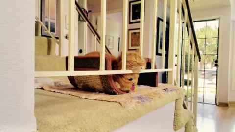 Yup. You guessed it. Catnapping again. I was keeping my eye on my hooman downstairs. But I couldn't keep my eyes open. I'm still on my fav catnapping place -- on our stair landing -- & still on my fav orange carpet. I can track my hooman & my 4-legged siblings as they walk past me or as they go up & down the stairs. I'm the oldest so it's my job to keep track of everyone & everything. That's enough to give any self-respecting feline a tummy ache, if you know what I mean.