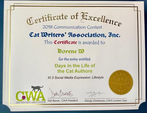 Here it is -- in all it's glory! Our first Award just for being 'us' in our very own home -- sharing our daily thoughts & doings --including our catnaps. We -- all of us (including our hooman of course) -- send the loudest PURRS & the biggest YOWLS of THANKS to the Cat Writers' Assocation!