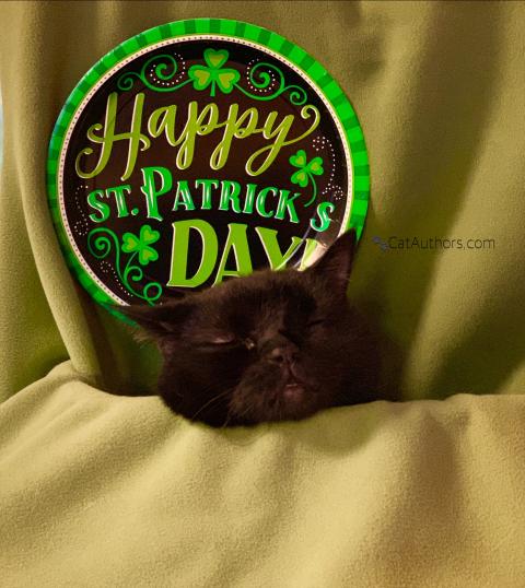 I'm not entirely sure what our hooman has planned for Saint Patrick's Day. But, I want to be ready so I'll start restin' up right here, right now. Then, before she wakes up, I move up the stairs, jump on her bed, curl up & go back to sleep. Then, when she wakes up, I'm the first feline she sees! I go into my purr mode immediately. Can't help it. And, if she could purr, she would be so happy to see me, she'd purr. Yes, there are other cats on the bed -- Spirit & sometimes the girls. Have a Happy Patrick's Day!!