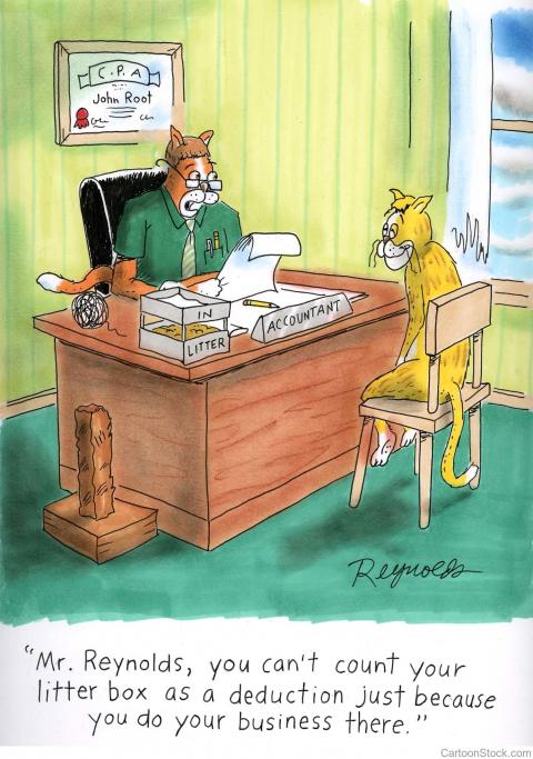 Our hooman saw this cartoon & thought it was purrfect for our blog. She had to pay for it -- or it could be a copywrong issue -- no, I mean a copyright issue. The cartoon's text at the bottom of the cartoon might not be visible due to pixels or whatever. So, I'll 'splain it to ya'. The Accountant is telling his patient, I mean client: "Mr. Reynolds, you can't count your litter box as a deduction just because you do your business there." Be sure & read our hooman's article: "CATS: COSTS & -- DEDUCTIONS?"