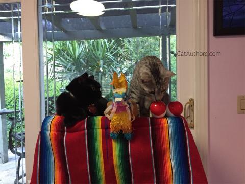 SPIRIT: OK, Mr. Know-It-All Inkee -- what am I sniffing? INKEE: 'Maracas.' SPIRIT: Are they toys for us? INKEE: No, not for us. They're a percusion instrument -- a gourd-shaped container filled with dried beans. SPIRIT: So, what do they do? INKEE: Hoomans hold them in their paws & shake them to the beat of the music. SPIRIT: Who's 'Music' & why do they beat him? INKEE: Good grief. Maybe someone can explain it to him? Please?