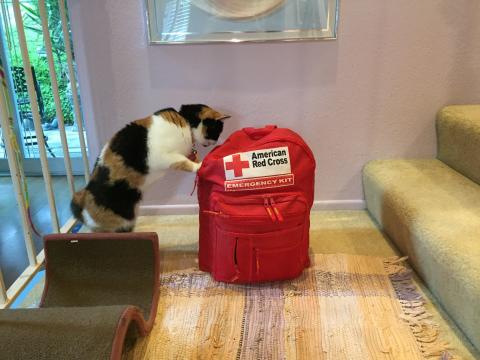 I'm doing my own personal inspection of this kit. Our hooman has an Emergency List. She used it during the mandatory evacuations for the Creek Fire in December 2017. The winds blew so hard that the flames raced towards our house & pelted us with big, hot embers! Our hooman had time to put important stuff in the car. Some people didn't. The most important stuff, our hooman said, was us -- our carriers, our food, our litter. We had to live away from our house for 5 days. Other than soot, our house survived. It was good to have a home to come home to!