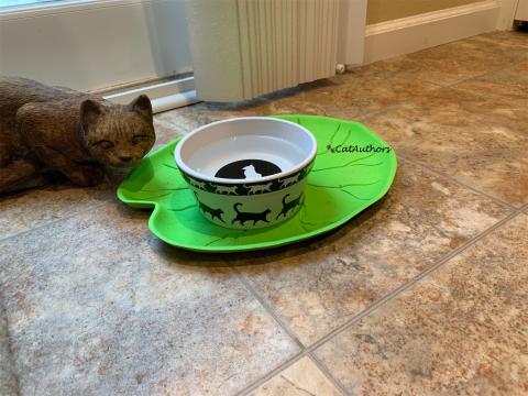 See the green thing? "It's a placemat for your water bowl," our hooman told us, "and it looks like a lily pad. Cool, huh?" Cool? Dunno bout that. But why our water bowl has to be "placed" on a lily pad is beyond my whiskers.