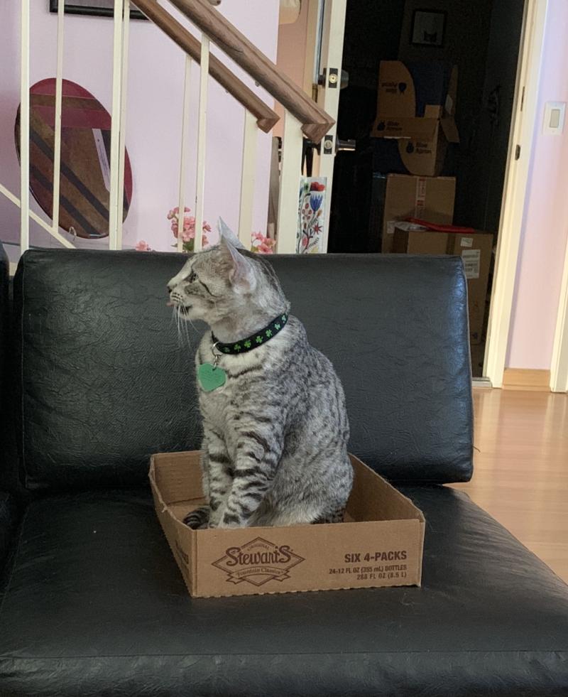 SPIRIT: He's just being a sore-head. So what if the box was too small and bulging at the side? Cats can nap anywhere -- in, on, or under either a big or small box -- size doesn't matter. Sigh. Don't tell him but I know where he's going. I know where to find him.