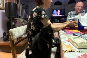 No, I didn't "take over" our dining room chair like my hooman thinks I did. It's called "sharing." I'm sharing the chair with with our friend and house guest, Muriel, at our dining room table. It's fun to sit with hoomans. Muriel has a nice soft voice. She & her husband, Lee, gave us lots of pets. Since when do cats not like attention? Know what I mean? Muriel even gave our hooman an idea on a creepy Halloween story. And, trust me, it turned out creepy!