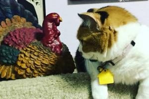 Gracee, you don't believe me do you? Turkeys can fly! Wild turkeys that is, not the turkeys raised on farms. Sophee, I don't believe anything you meow! So prove it. We'll watch for a flying turkey. Betcha we'll be here next week waitin' & watchin.' Gracee, doubt we'll see one here 'cause wild turkeys are mostly on the East Coast, not the West Coast. We're on the West Coast, remember?
