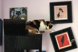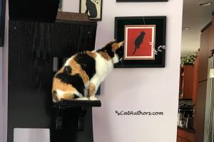 Am I actin' & lookin' sweet & innocent enough? Meowmuh still hasn't noticed the crooked picture. You know, we have dozens of earthquakes in Los Angeles. None recently? None today? Well, she won't know. She's busy & tired. I'm just gonna' kick-it up here. I'm on the top step of the cat tree now. My ears almost brush the ceiling. Well, not really. I'm not a liar. I just like to tell 'stories' & do 'things' that none of the other cats even think about saying or doing! Meowmuh says the things I say & do are highly creative. I'm highly certain she's right.