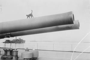 Per an article written by Mark Strauss 8/22/2014: "As the US Naval Institute explains: 'It is likely that the ancient Egyptians were the first seafarers to realize the true value of having cats as shipmates. ...Without the presence of cats, a crew might find their ship overrun with rats & mice that eat provisions, chew through ropes & spread disease.' " THIS PIC SHOWS: SHIP'S CAT STRUTTING ALONG THE BARREL OF A 15-INCH GUN ON THE DECK OF THE HMS QUEEN ELIZABETH GALLIPOLI PENINSULA, 1915 (BIBLIOTHEQUE NATIONALE DE FRANCE)