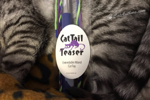 Gracee: I've got it!! Sophee: I've got it!! Gracee: No, I've got it. Sophee: No, I've got it!! Meowmuh is holding the soft-grip handle of the sturdy light-weight aluminum wand (fully extended to 47") called the 'CatTail Teaser.' She's dangling the durable, faux suede strands for the girls to grab -- & they are! It's hand-assembled in the USA. You can have one too by contacting sales@shopmeoow.com. ...