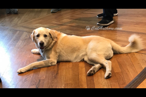 This is an 'elder' guide dog at an ALOUD presentation at the Los Angeles Central Library. Meowmuh went with our auntie, Laurel. The presenter was Stephen Kuusisto, also known as the Blind Poet. He discussed passages in his book about the limits on his life prior to deciding to apply for a guide dog. Of compelling interest was the saga of his sojourn in & through Guide Dog School. The training was extensive &, for the first time, he met hoomans like himself--blind hoomans.