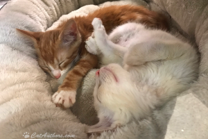 Meet two precious kittens at the Pasadena Humane Society's 'Neely Center for Cats.' These two little ones are in the midst of a serious kitten-nap. They must really be tired because there were a lot of people milling around looking to adopt. NOTICE: They are sleeping IN their cushy little bed. The kittens in the next pic found their own, unique place to nap.