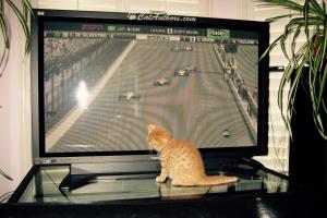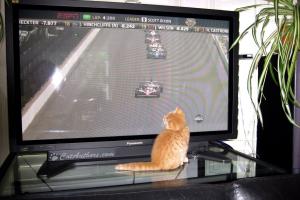 Jumped down from my cat tree & ran across the living room to the TV. I love the TV. I gotta' watch things move. Now I'm lookin' over my shoulder to watch those things called cars comin' at me. Meowmuh says it's May 29, 2011--the morning of the Indianapolis 500 -- a big car race that lots of hoomans watch. They gather together in what they call 'crowds.' The 'crowd' wants to see which hooman drives the car-thingie the fastest. And, trust me, they're movin' mighty fast!