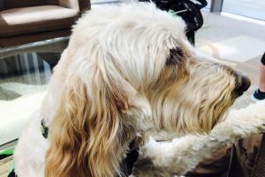 This guy is big. He's a Golden Doodle, whatever that is. But, most important, he's a Certified Therapy Dog. He graduated from the year long course. Now, as soon as his vest is on, he knows he is going to 'work.' He'll become something other than 'just a dog.' He was trained to put his chin & paw on the patients he visits. He works in an assisted living home & is going to branch out to hospices. When his vest comes off, he is all dog -- jumping between the beds in the room, tearing all the towels off the racks. We think he deserves as much 'I'm-gonna'-be-a-dog' time as he wants.