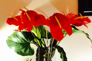 Meowmuh discovered a long white box leaning on the front door yesterday. The gift card on the front of the box said: "Thank you for being such a good mommy to us. Love, Gracee, Inkee, Sophee & Spirit." How did we cats send her flowers? Well, we'll tell you. Our Auntie Laurel did one of those things that only hoomans can do. She sent our Meowmuh a Meowmuh's Day gift -- these beautiful flowers from Hawaii. Thank you, Auntie Laurel.