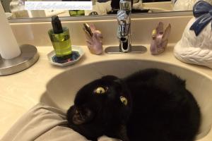 I love sinks! I'm upstairs, in the round bathroom sink. What's really fun is unscrewing the top to the drain. Then push it onto the counter & out onto the floor. Meowmuh didn't think a cat could do it but one day I showed her. None of our sinks or tubs have drain tops now. I guess she put them all in a drawer.