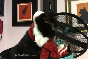 First I have to wear this dumb scarf, Inkee says I haven't been good, early this morning hoomans made loud noises power-washing our house & windows cause of the soot from the fire, so I ate breakfast too fast & threw up & now my whiskers got caught on my sweater. I hope your day is going better. Bah, humbug.