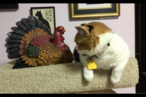 This is one bold turkey. Go away, turkey. This is a 'cats-only' cat-tree -- let me be real clear -- this cat-tree is a 'turkey-free' zone. I don't want to hear any gobble, gobble, gobble-dee-gook -- just split. Oh, oh. Do you hear what I hear? Meowmuh's calling you. She wants you in the oven, I mean the kitchen!
