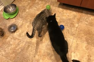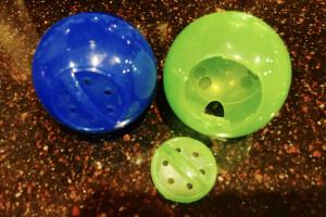 Here they are -- our SlimCat Interactive Feeders. The green ball's circle-top is off. The blue ball's circle-top is still on. The openings around each ball let the food drop out when we roll 'em. Meowmuh adjusted the size of the openings. Our dry food is big so the openings are at their largest. Be sure to watch our video: Huntin' for Food.