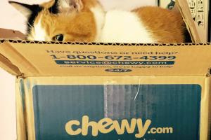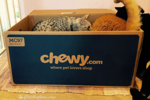 Tails up on this investigation. That's my orange tail. We're investigating the newest and biggest delivery ever. And it's for us. We love boxes, especially Chewy boxes. Be sure & check out the "Cat Cabinet" that Meowmuh organized just for us. (Disclaimer: No money or offers have been made by Chewy to display the boxes.) Online ordering works for us & the boxes are fun.