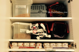 This is it! Our very own "Cat Cabinet." The top two shelves have our dry food & our old carriers (we're getting new ones). Why new carriers? 'Cause we're special. The next shelves have our food delivered to our door by Chewy. Purrrrr. Below that are the drawers with our toys.