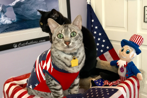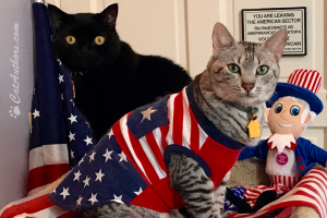 Inkee-Bear & I are hard-core patriotic Americats, know what I mean? Just wanna' wish all you two-legged and four-legged patriots out there a safe and Happy Fourth of July. Meowmuh has the TV on so the noises aren't too bad & she sprayed Feliway to calm us. Actually, I'm goin' to take a little nap, you know, a cat nap.