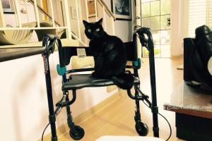 My fav thing to do? Ride on Meowmuh's walker. She walks, I ride. Doesn't matter if it's 3 am or 3 pm. She walks, I ride. When it's just sittin' there, if I run fast & jump on it, it rolls.That's a real ride! Read 'Why is the Walker So Heavy?' & 'Meowmuh's New Knee' under MEWS 'N NEWS.