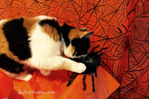 I gotta' take this Hallow-weird investigation into my own paws. The pun-kin's harmless. But, what is this thing? It's black all over--like a little Inkee-Bear? No, no. Look at all those legs. It climbed up here? Or dropped down from--? Like Spider Man? Wait, I know--it's a big spider!