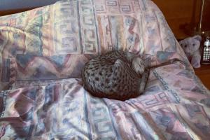 You better not wake me up! I don't care if it is Labor Day weekend. I start each day (if I meow loud enough and long enough) outside in my stroller. Yes, it's hot out but I love watching everything outdoors. Being on my leash is even better than being in my stroller. When I come inside, I have a snack then I chase my siblings around, flip my toys in the air, persuade my hooman to toss them (she's a pretty good tosser), then I work out on the exercise wheel while she cleans our litter box then it's nap time -- catnap time, that is. Have a good Labor Day Holiday!