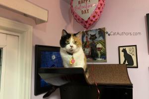 I’ve been waiting to ask the neighbor’s cat to be my Valentine. But she never showed. My hooman says it’s because it’s been raining — cats don’t like rain. I wouldn’t know. Me? I’m an indoor cat — except when my hooman takes me out in the stroller. Well, I can at least wish YOU — Happy Valentine’s Day!