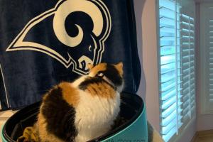 Yikes! That's a ram? A male Bighorn Sheep? Not a mountain goat. Those things on their heads -- horns -- can weigh up to 30 lbs? They can jump 20 feet? They can weigh up to 300 pounds? They can balance on a 2 inch rock ledge in the Rocky Mountains? The males fight for dominance by ramming each other? At speeds up to 20 MPH? Maybe that's what Spirit is doing. Trying to be dominant. Well, the Rams will be ramming those Patriots. We'll go 'cat-razy' for our Los Angeles Rams. Go RAMS!