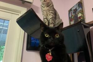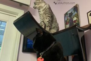 Our hooman’s taking a break from our photo shoot. Maybe she’s frustrated cause we keep moving, scattering. In this pic we’re lookin’ in different directions, we’re on different levels, we’ve been pouncing on the ribbons that dangle from those bah-loons that keep moving — scraping & bouncing on the ceiling & walls. You know we cats LOVE anything that moves. We’re having fun & hope you are too! Happy Valentine’s!!!