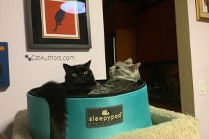 Our hooman's been sitting in front of that screen for a long, long time. It's very late. Maybe she's writing about us. We help her as much as we can -- including not stepping on the keys in front of the screen. She tells us: "Be careful, don't step on the keys." I never do but some of my sibs -- well, sigh. It's been dark out for a long time now. So, we're waiting for her to come to bed. We're telling her to hurry up! We need to get to sleep. Some of my sibs are already asleep.