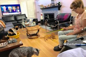 Meowmuh needed help for a few days after she got out of the hospital 'cause she's the only hooman that takes care of us. She wanted hoomans who liked cats & weren't allergic. She found HomeWatch. They liked us & we liked them. Here, HomeWatch's Amalia plays with us.