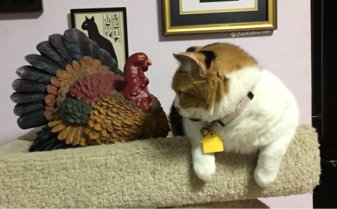 I had a really bad dream just a minute ago...a nightmare. A really, really big, mean bird landed next to me in my cat tree. Oh, it wasn't a dream?  It's for real? It's a Thanks-what bird? We eat it? No? You eat it. I don't get any? Do they make turkey cat food?  Anyway, this turkey says to all you pilgrims out there, have a Happy Thanksgiving!