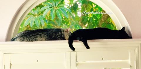 This is one of my fav spots to nap. Up on our cat-walk, we can nap, soak up the sun, wake up, stretch & look outside. We can watch the tree, the leaves, the birds, the street, the sidewalk, the people, the trucks--we can watch it all. It is a totally rad nap spot. And, in case you didn't notice, my big brother, Inkee-Bear agrees with me.