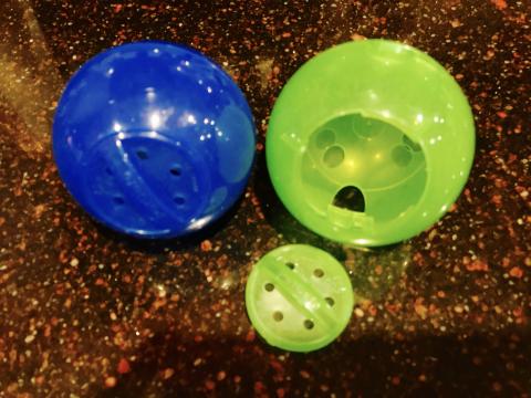Here they are -- our SlimCat Interactive Feeders. The green ball's circle-top is off. The blue ball's circle-top is still on. The openings around each ball let the food drop out when we roll 'em. Meowmuh adjusted the size of the openings. Our dry food is big so the openings are at their largest. Be sure to watch our video: Huntin' for Food.