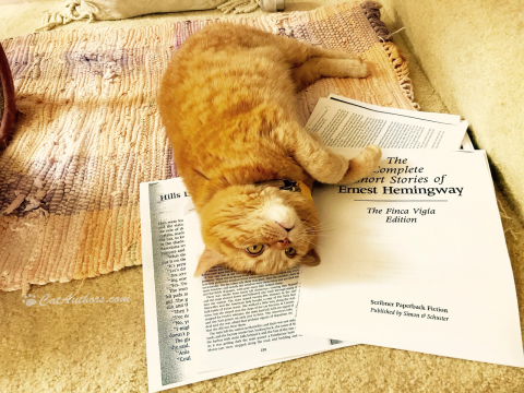 Yes I CAN! I can "absorb" these stories while I'm upside down. They're handouts from Marion Bright's writing class in Pasadena. I found 'em on the stair landing, & rearranged 'em into a comfy nest for catnapping. See Hemingway's story? He loved cats, particularly polydactyl cats. Click on "Hemingway's 6-Toed Cats" news article to learn more.
