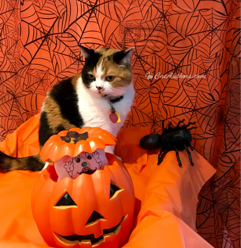 Why so much orange? Cause of Hallow-weird--Halloween? Why are these "things" sittin' here? Too weird. I mean, if you're lookin' at my pic, are you left like totally speechless? meowless? An orange pup-kin? It makes a yowlin, ghoulish sound that makes me literally flee to my blanket. No, not on it, under it. Know what I mean?