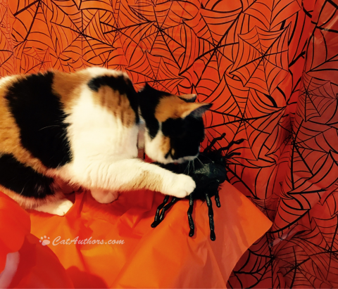 I gotta' take this Hallow-weird investigation into my own paws. The pun-kin's harmless. But, what is this thing? It's black all over--like a little Inkee-Bear? No, no. Look at all those legs. It climbed up here? Or dropped down from--? Like Spider Man? Wait, I know--it's a big spider!