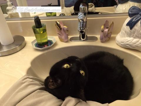In case you couldn't recognize me, it's me, Inkee-Bear. I'm in my 'anytime-anywhere' fav position--upside down in the round, upstairs bathroom sink. I see you, I know who you are. Cats like to look at things upside down. Well, I do. All the time. Sinks are such fun. Oh, while you're in the sink, if you paw enough at the spout -- the water drips out! Totally cool. Try it!